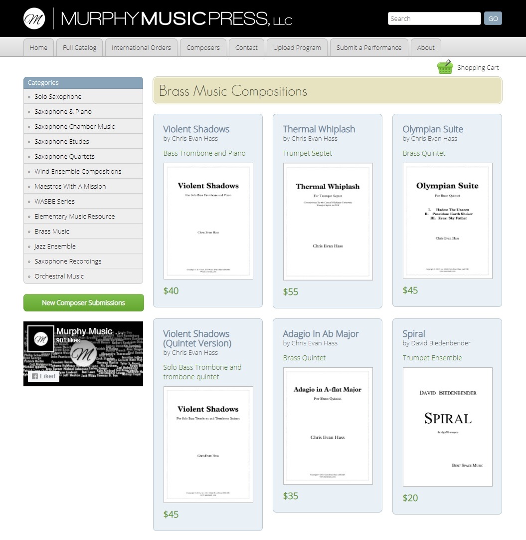 I’m happy to share that several of my brass solo and chamber pieces are now published through Murphy Music Press! The pieces include my brass quintets Olympian Suite and Adagio in A-flat Major, as well as both versions of my bass trombone solo Violent Shadows and my new trumpet septet Thermal Whiplash. I’ve been very grateful for all the work Sean Murphy has done publishing my saxophone and band music and am excited to have these works entering his brass catalog!